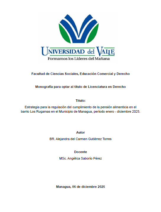Este protocolo de investigación se centra en el problema del incumplimiento de la pensión alimenticia en el barrio Los Rugamas de Managua, con el objetivo de diseñar una estrategia integral para regular su cumplimiento entre enero y diciembre de 2025. El estudio busca identificar las causas de la falta de pago, elaborar una estrategia efectiva y validarla mediante mecanismos de seguimiento.
