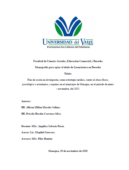La presente investigación aborda, sobre el maltrato físico, psicológico y económico hacia los equinos, en el municipio de Managua, donde estos animales constituyen un recurso esencial, para el transporte, el comercio y la subsistencia de familias en condiciones de vulnerabilidad. A pesar de la existencia de la Ley N.º 747, “Ley para la Protección y el Bienestar de los Animales Domésticos y Animales Silvestres Domesticados”, su aplicación continúa siendo limitada por la escasa divulgación, la débil fiscalización y el desconocimiento de la población.