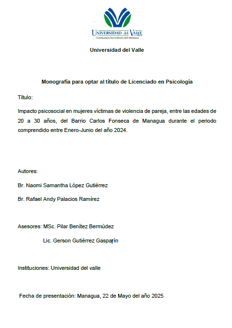 La presente investigación, se centra en determinar el impacto psicosocial que enfrentan las mujeres de entre 20 y 30 años que han sido víctimas de violencia de pareja en el barrio Carlos Fonseca de Managua. El análisis aborda aspectos psicológicos, emocionales, sociales y físicos para comprender las características comunes entre las víctimas, los efectos que enfrentan y las posibles estrategias efectivas para prevenir esta problemática. A través de un enfoque cualitativo y descriptivo, se identificaron las características psicosociales predominantes en las mujeres afectadas.