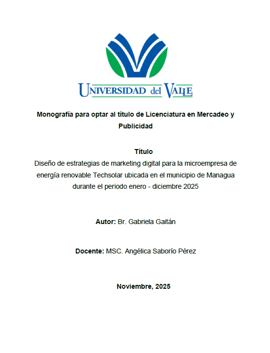 La presente investigación tiene como objetivo diseñar una propuesta de estrategias de marketing efectivas y adaptadas a las necesidades de la microempresa de energía renovable Techsolar, ubicada en el municipio de Managua, durante el período de enero a diciembre de 2025, con el fin de fortalecer su posicionamiento en el mercado y aumentar su visibilidad ante su público objetivo. Esto se llevó a cabo mediante el análisis de las estrategias de marketing previas aplicadas en la empresa y la evaluación de la efectividad, los métodos utilizados para fortalecer la lealtad de los clientes. Además, incluye la propuesta de una estrategia de marketing y fidelización para la microempresa Techsolar basada en la mejora de la satisfacción de los clientes