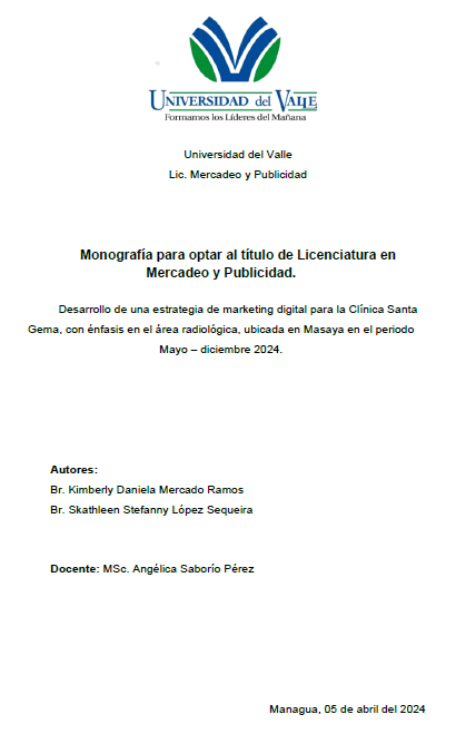La presente monografía desarrolla una propuesta de estrategia de marketing digital dirigida a la Clínica Santa Gema, ubicada en la ciudad de Masaya, durante el periodo de mayo a diciembre del año 2024, con especial enfoque en el área de radiología. El estudio parte de la necesidad de mejorar la visibilidad y posicionamiento digital de esta área específica, aprovechando herramientas tecnológicas actuales y canales digitales adecuados.