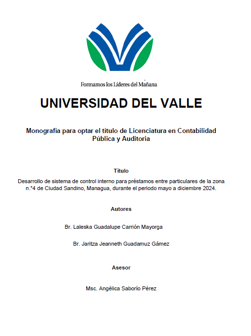 El presente estudio analiza la implementación de un sistema de control interno para préstamos entre particulares en la zona n.°4 de Ciudad Sandino, Managua, durante el periodo de mayo a diciembre de 2024. En Nicaragua, los préstamos entre personas han adquirido una gran relevancia económica, especialmente en zonas con acceso limitado a servicios financieros formales. Sin embargo, la falta de un control interno adecuado ha generado problemas como fraudes, tasas de interés abusivas y poca transparencia en las transacciones.