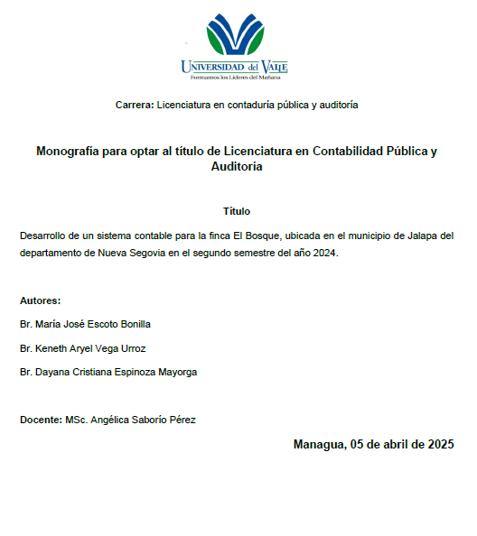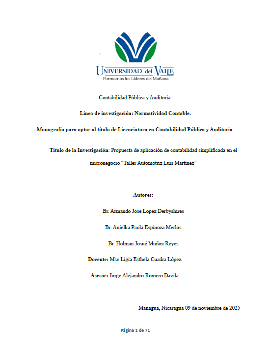 El presente estudio aborda la implementación de un sistema contable en la microempresa “Jehová Jireh Granada”, dedicada a la comercialización de repuestos de motos, ubicada en el municipio de Granada, durante el periodo comprendido entre enero y diciembre de 2025. La empresa enfrentaba dificultades significativas relacionadas con el manejo manual y poco estructurado de sus registros contables, lo que afectaba la precisión de la información financiera y limitaba la toma de decisiones estratégicas.