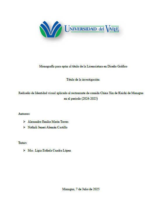 El sector gastronómico de Managua enfrenta alta competitividad, exigiendo estrategias innovadoras de diferenciación. Este estudio analiza el restaurante de comida china Xin de Kaishi, cuya identidad visual fragmentada (logotipo desalineado, paleta cromática inconsistente y comunicación digital deficiente) limita su capacidad para atraer y retener clientes. Mediante metodología Cualitativa (Reseñas de clientes, observación y benchmark de antecedentes), se identificó que: La imagen actual se asocia con falta de profesionalismo y existe una valoración positiva hacia propuestas que equilibren autenticidad cultural y adaptación local.