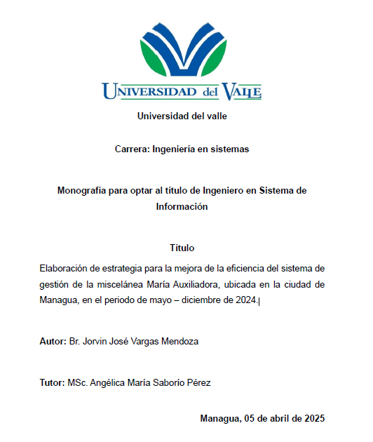 En este trabajo se aborda la problemática que enfrenta la miscelánea María Auxiliadora, ubicada en Managua, al implementar un sistema de gestión sin la capacitación adecuada, lo que ha generado ineficiencias en procesos clave como el manejo de inventario, ventas, facturación y gestión de proveedores. Este estudio tiene como propósito desarrollar estrategias para optimizar la eficiencia operativa del sistema, mejorando la rentabilidad y sostenibilidad del negocio.