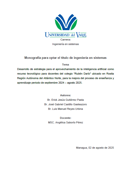 El presente estudio tiene como finalidad proponer una estrategia para la implementación de la inteligencia artificial (IA) como recurso tecnológico en el proceso de enseñanza-aprendizaje en el Colegio “Rubén Darío”, ubicado en Rosita, Región Autónoma de la Costa Caribe Norte de Nicaragua. La investigación surge ante las limitaciones estructurales, formativas y tecnológicas que enfrenta la institución, especialmente en lo relacionado con el uso pedagógico de tecnologías emergentes. A nivel internacional, la IA ha demostrado su potencial para personalizar el aprendizaje y mejorar los resultados académicos, y su incorporación en contextos rurales representa una oportunidad para reducir brechas educativas. En el contexto nacional, el Ministerio de Educación (MINED) promueve la digitalización educativa, aunque reconoce los obstáculos existentes en infraestructura, conectividad y capacitación docente, particularmente en zonas rurales. El estudio utiliza una metodología cualitativa-cuantitativa con enfoque participativo, considerando entrevistas, encuestas y análisis institucional, y plantea una propuesta de implementación que incluye fases de diagnóstico, capacitación docente, desarrollo de herramientas tecnológicas y monitoreo. La propuesta está alineada con los Objetivos de Desarrollo Sostenible (ODS),