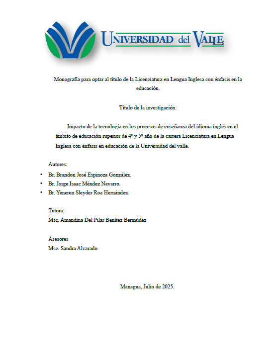 El presente estudio analiza el impacto de las tecnologías digitales en la enseñanza del idioma inglés en la Universidad del Valle, Managua. Con un enfoque cuantitativo y diseño descriptivo, se aplicaron encuestas estructuradas a estudiantes y docentes de la Licenciatura en Inglés con énfasis en Educación, con el fin de conocer el uso, la percepción y la efectividad de las herramientas tecnológicas en el proceso de aprendizaje. La población estuvo compuesta por estudiantes y profesores de la carrera, seleccionándose una muestra representativa para la recolección de datos.