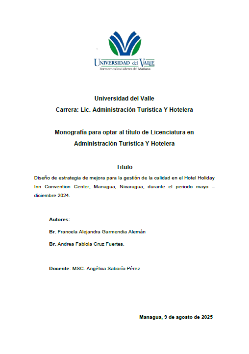 El presente trabajo de investigación tuvo como objetivo principal diseñar una estrategia de mejora para la gestión de la calidad en el Hotel Holiday Inn Convention Center Managua, durante el periodo de mayo a diciembre de 2024. Esta propuesta surge ante la necesidad de fortalecer los procesos internos del hotel, especialmente en áreas clave como el restaurante, el mantenimiento, la atención al cliente y la capacitación del personal, con el fin de elevar la satisfacción de los huéspedes y mantener la competitividad en el sector hotelero nacional.